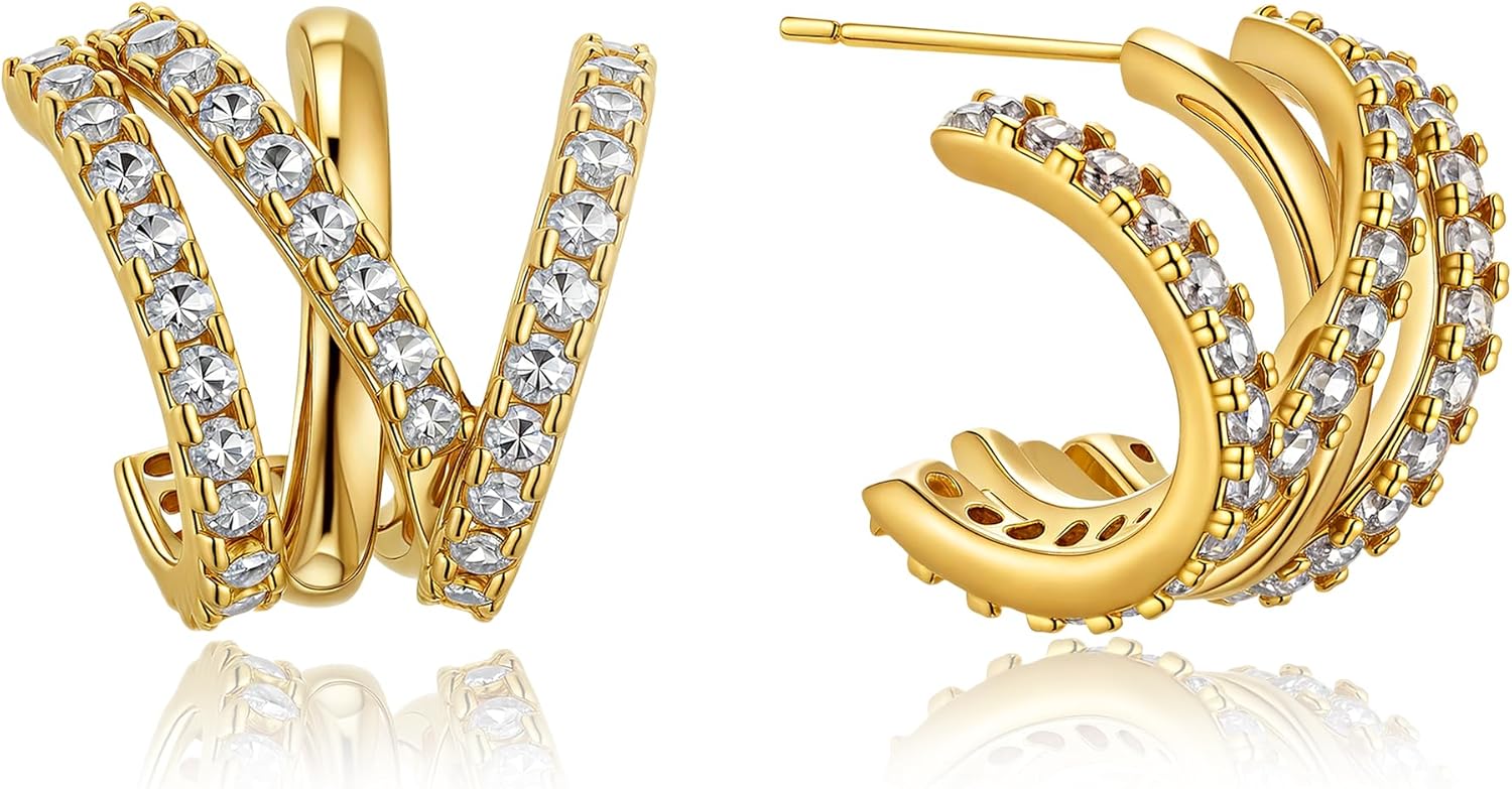 Triple Hoop Illusion Stud Earring for Women – 14K Gold Plated Unique Diamond Huggie Stud Earrings for One Piercing – Faux Multi Hoops Design, Hypoallergenic Fashion Jewelry Earrings