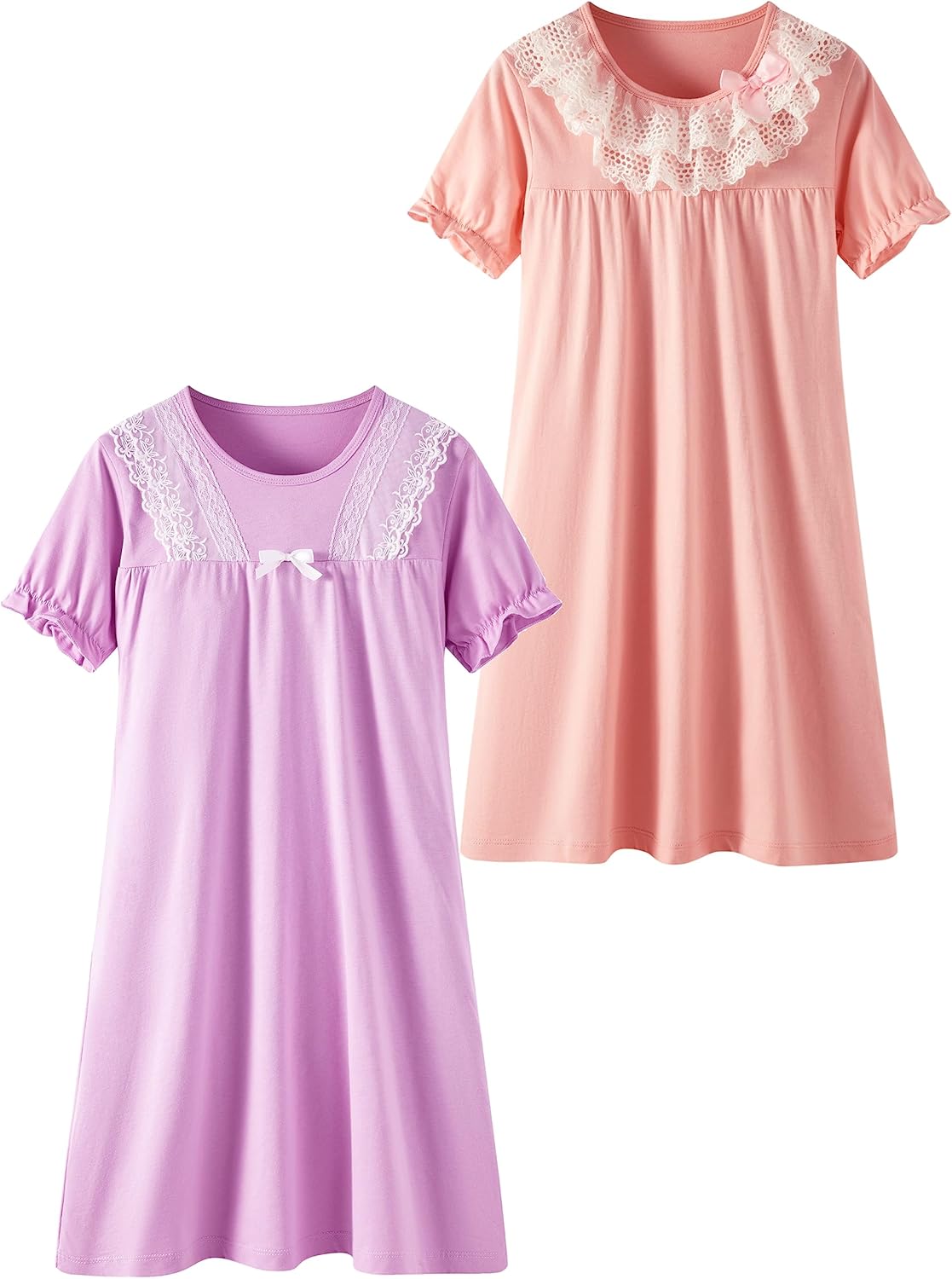 Girls Nightgowns Vintage Princess Night Gown Dress for Toddler Kids Short Sleeve Nightdress 2-Pack 5-12 Years