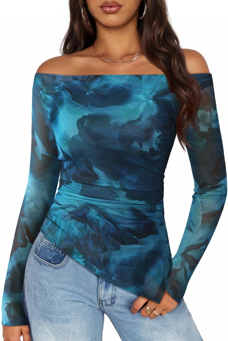 ZESICA Floral Mesh Off Shoulder Long Sleeve Tops for Women 2026 Y2k Double Lined Sheer Spring Going Out Shirts