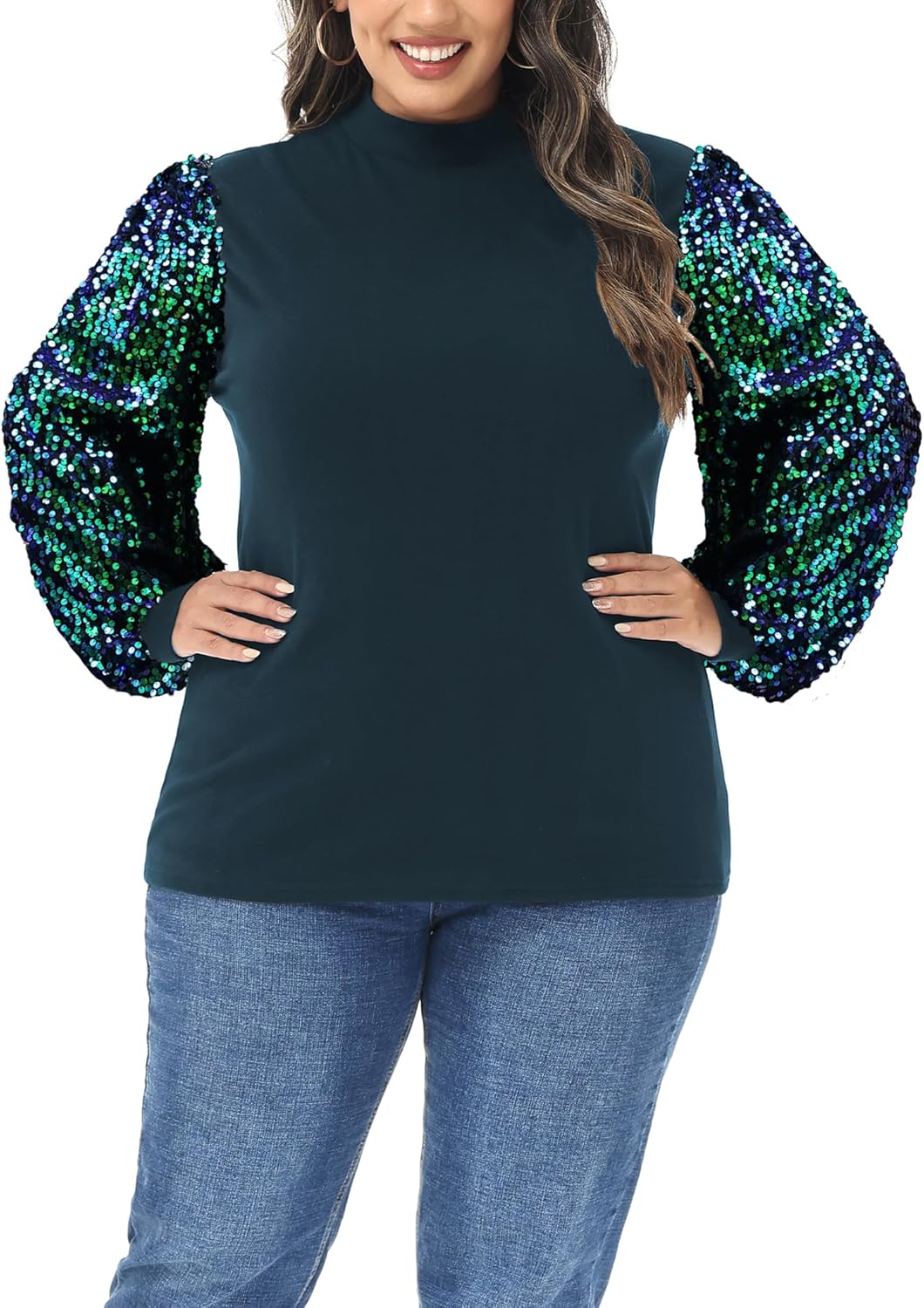 Anna-Kaci Women's Plus Size Sparkle Sequin Sweatshirt Mock Neck Pullover Long Sleeve Glitter Party Tops