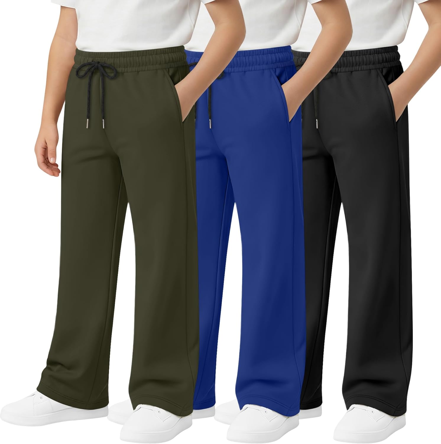 3 Pcs Boys Sweatpants Wide Leg Open Bottom Drawstring Elastic High Waist Joggers Baggy Athletic Pants with Pockets
