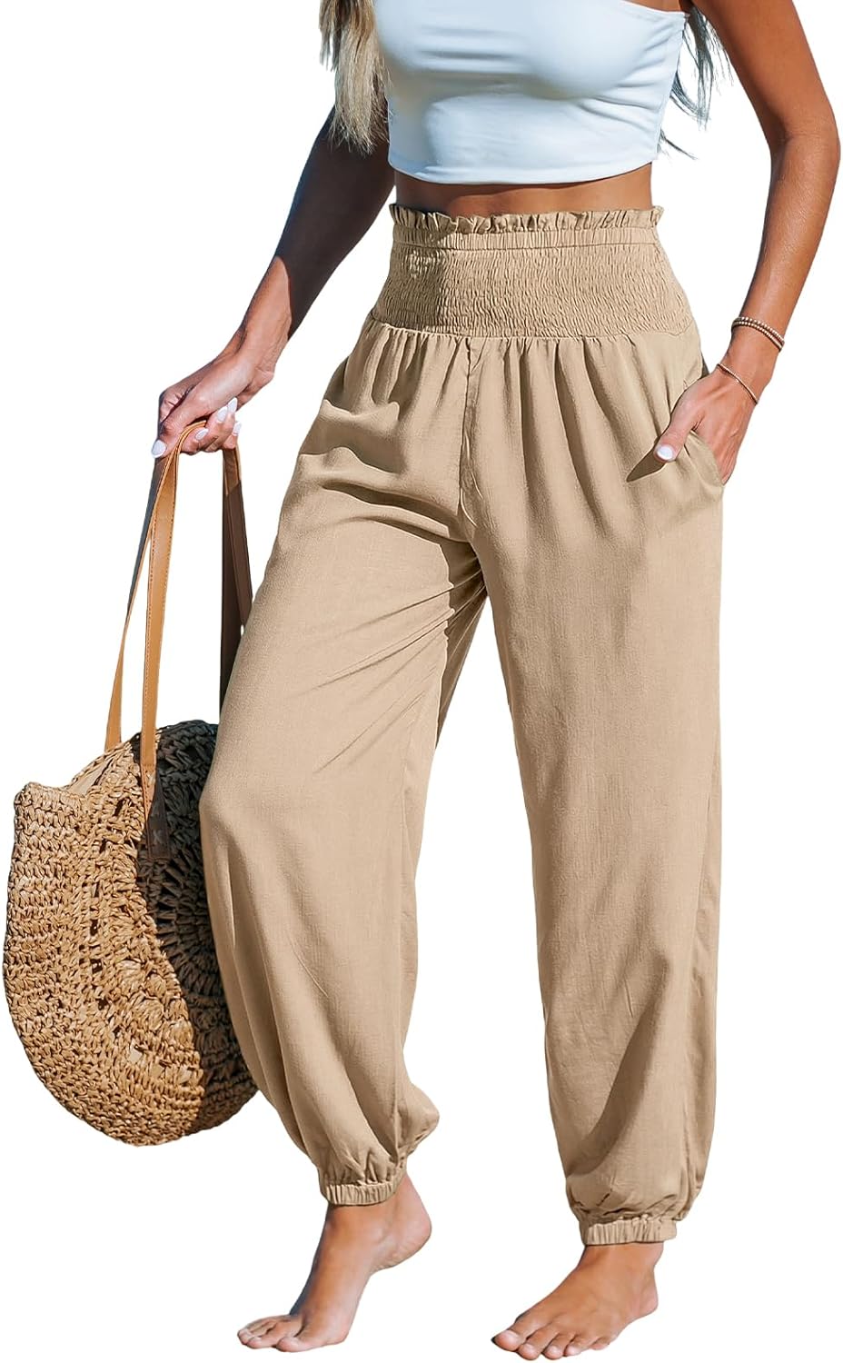 CUPSHE Women Pants with Pocket Smocked Waist Wide Leg Ruffle Loose Fit Pant Casual Beach