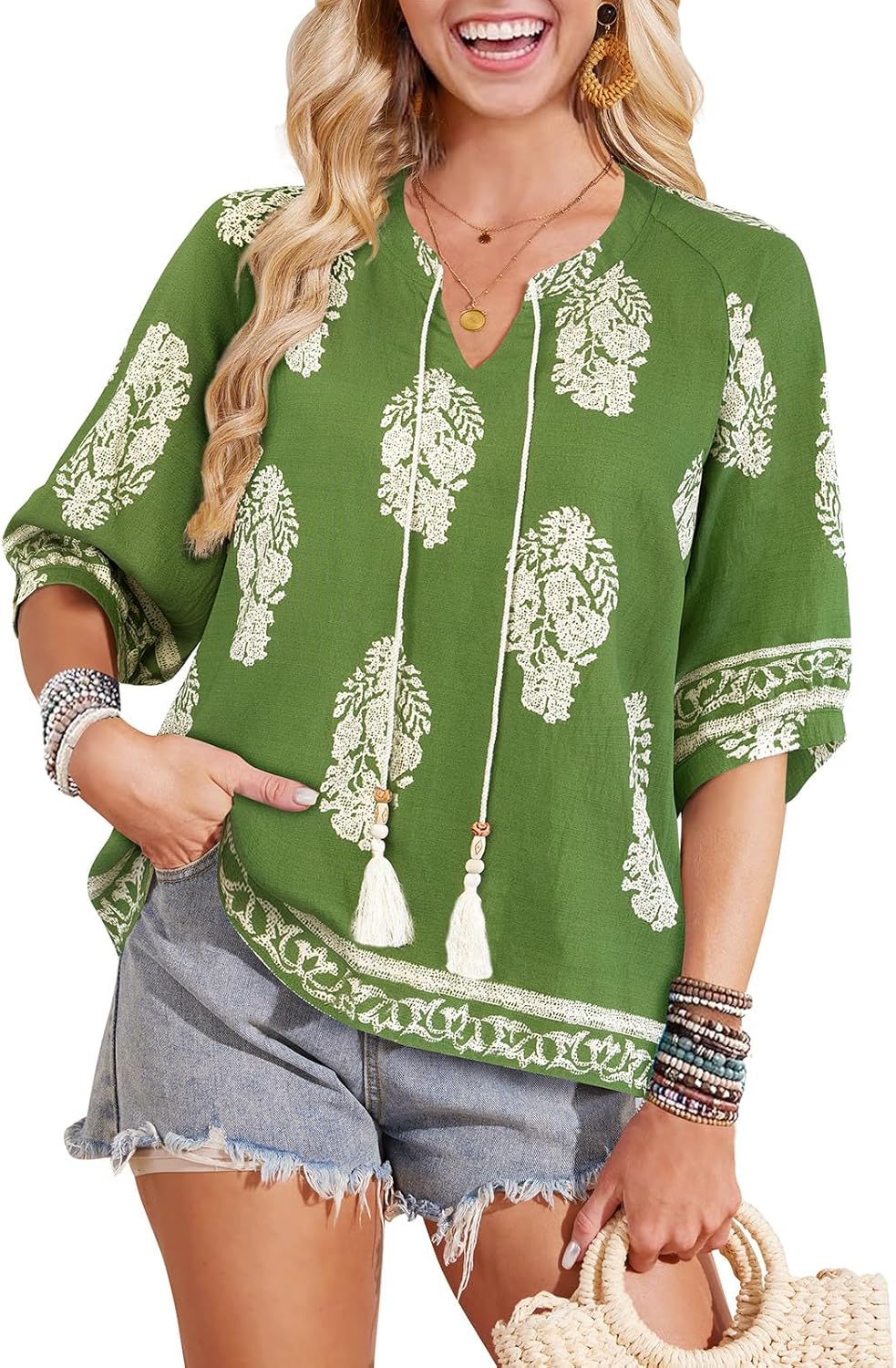 Bulotus Womens Boho Tops Spring Summer 3/4 Sleeve Drawstring V Neck Blouse Dressy Casual Shirts Beach Vacation Clothes