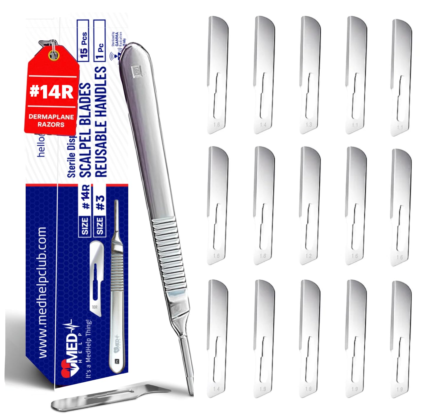 - [15 x SCALPEL BLADE #14R WITH REUSABLE HANDLE #3] SAVE SOME MONEY- pack of 15 MedHelp sterilized blade scalpels help you learn to dermaplane by yourself, and you can safely use it for a lot of small aesthetic procedures: great as a scalpel for callus, podiatry scalpel, dermatology scalpel pedicure, cyst removal blade, blackheads removals, acne scalpel, dissection and suture practice, and more;