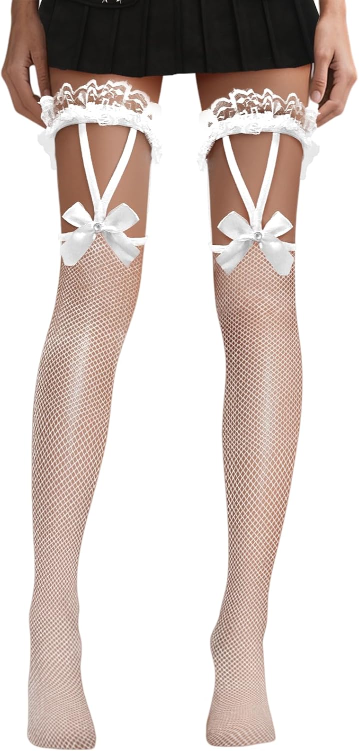 White Fishnet Thigh High Stockings with Bow, Women's Sexy Sheer Over the Knee Stockings, Stretchy Hollow Out Tights Pantyhose for Lingerie, Cosplay, Clubwear, One Size