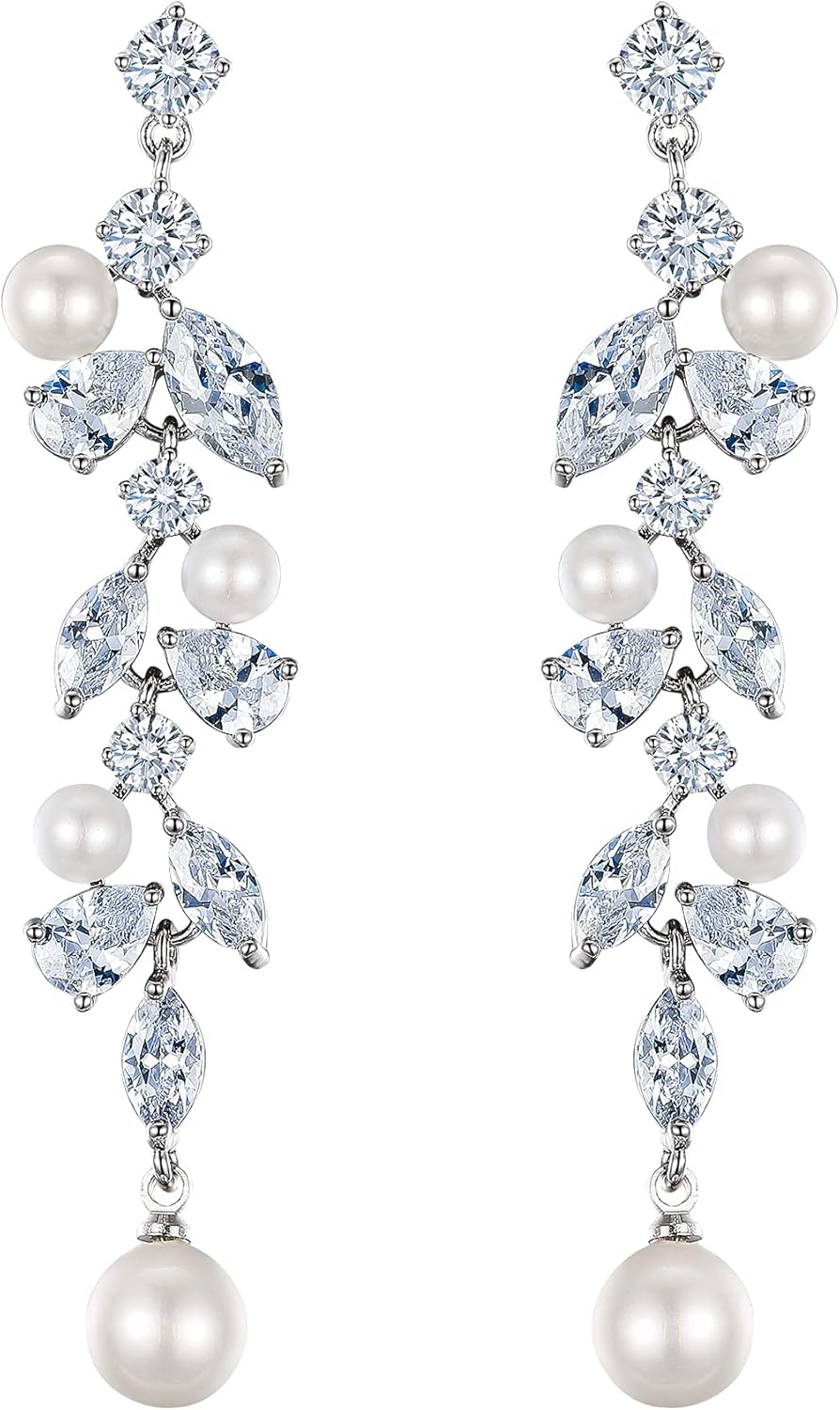 Watforsh Silver Pearl Dangle Earrings for Women with Leaf Shaped Cubic Zirconia Drop Teardrop Pearl Statement Earrings for Wedding Brides