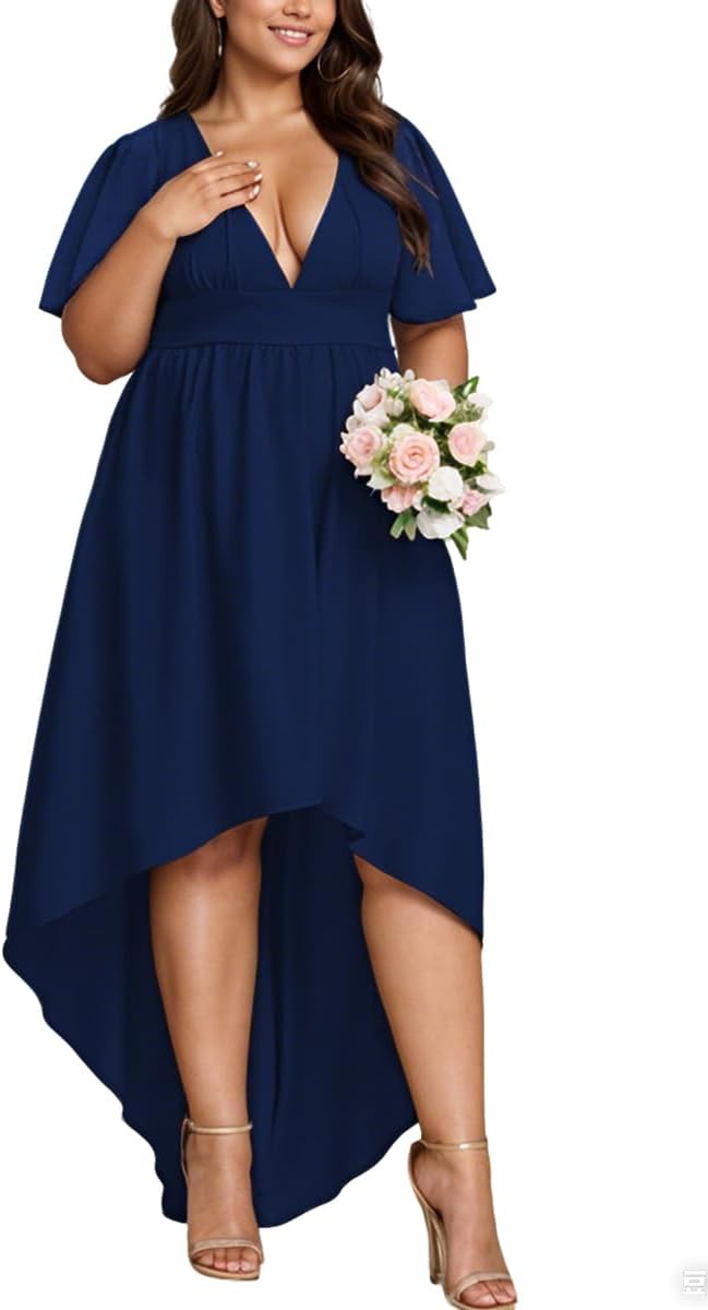 Elegant Dresses Formal Evening Cocktail Long Maxi Wedding Party Dress Sexy V Neck Ruffle Sleeve Hi Low Flowy Gowns