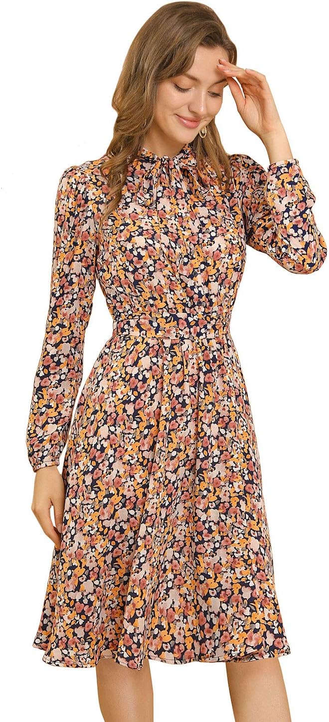 Allegra K Women's Tie Neck Dresses Chiffon Long Sleeve Belted Vintage Floral Dress