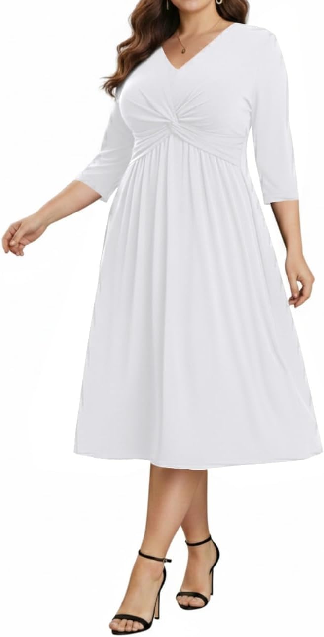 Plus Size Dress for Women Twist Knot V Neck 3/4 Sleeves A Line Wedding Guest Midi Dresses