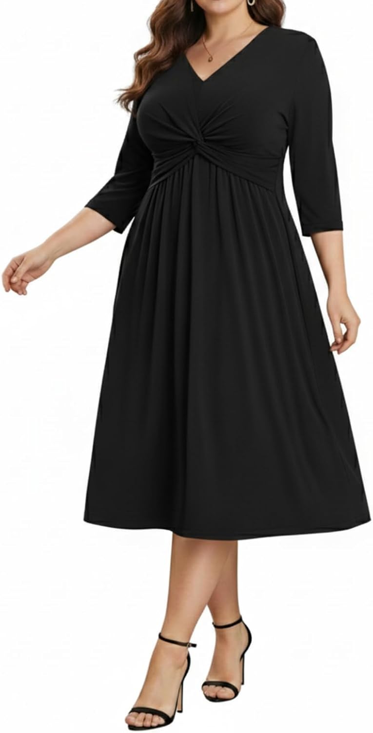Plus Size Dress for Women Twist Knot V Neck 3/4 Sleeves A Line Wedding Guest Midi Dresses