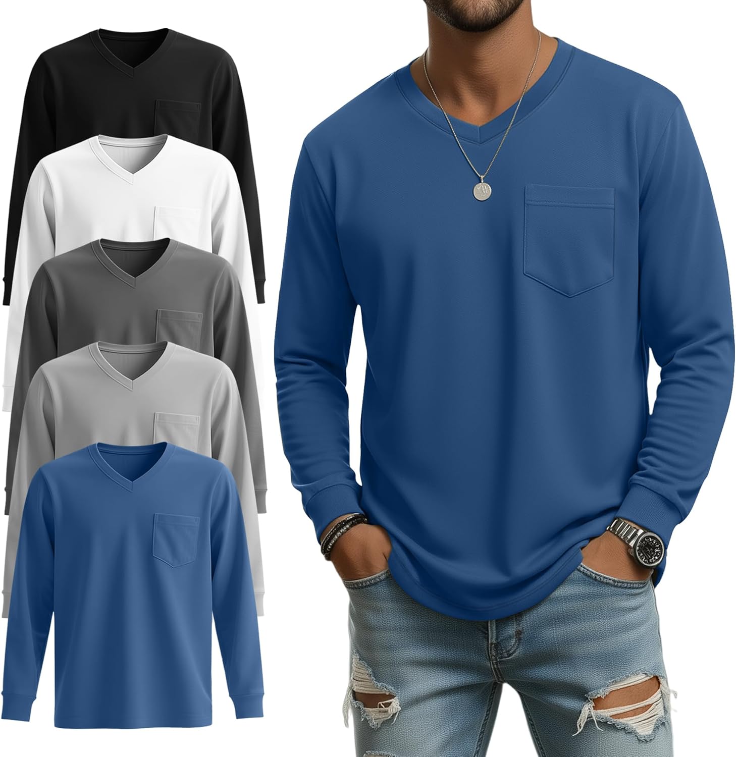 5 Pack Men's Big and Tall Shirts Long Sleeve V Neck Tee Casual Oversized Tops Loose Basic T Shirts with Pocket
