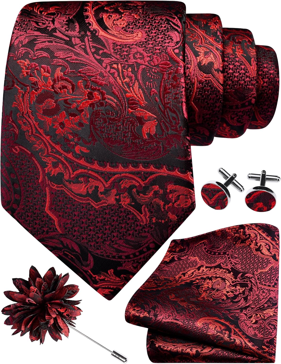 GUSLESON 8cm Paisley Tie Set for Men Necktie Lapel Pin Pocket Square Cufflinks Set for Men