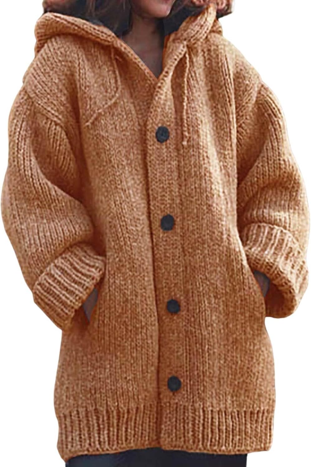 Womens Cable Knit Thick Button Hooded Cardigan Jackets Long Sleeve Chunky Fleece Winter Sweater Coats with Pockets