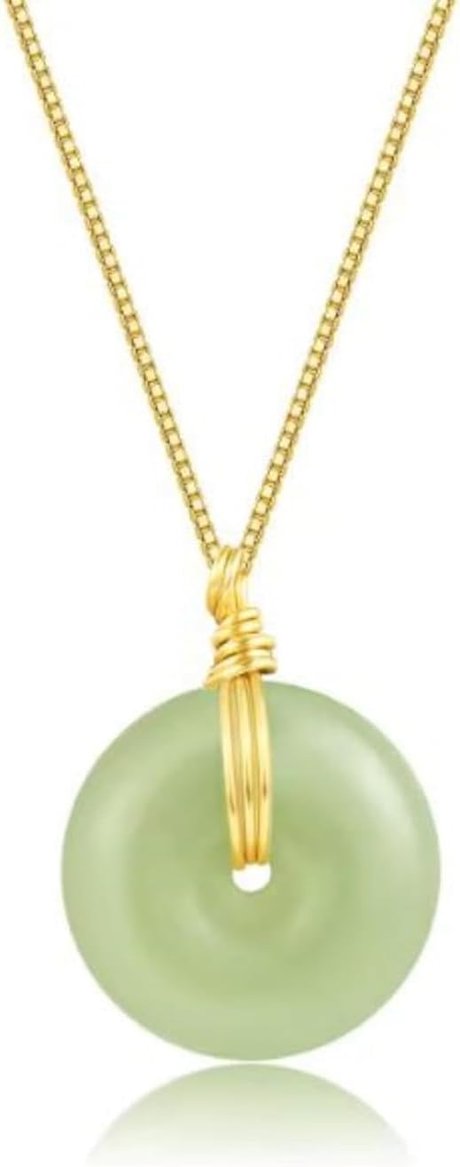 Natural Hetian Jade Pendant Safe Buckle Necklace, Real Green Donuts Jade Charm Pendant Adjustable Choker Necklaces for Mom Lover Her (925 Sterling Silver with Gold Plated)