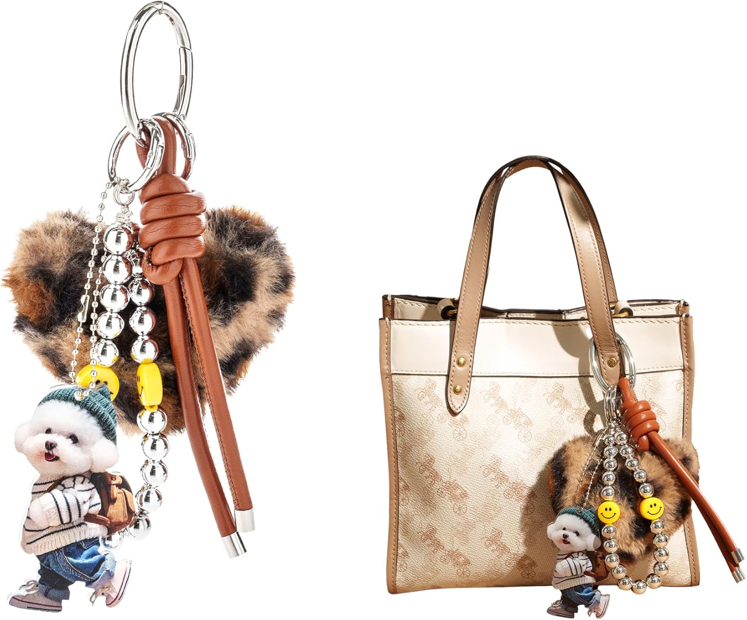 Heart pom Keychain for Women Plush Bag Charm Set, Blue PU Leather Strap & Dog Tag | Cute Purse Charms for Handbags
