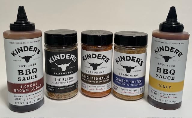 - Your 5 Count Bundle includes: Kinder’s The Blend, Woodfired Garlic, and Cowboy Butter Seasoning/Rub(s) and BBQ Sauces - Hickory Brown Sugar and Honey BBQ. Elevate your grilling game with this signature Kinders flavorful bundle, the perfect addition to any backyard cookout, camping, or family feast.