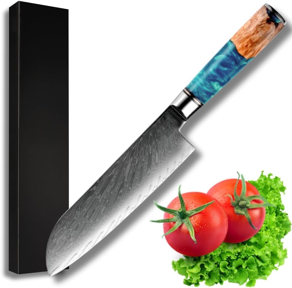 SHOKUNIN USA Kerie Santoku Knife, Damascus Chef Knife, Sharp, Chef Kitchen Utility - Vg10 Stainless Damascus Chopping Knife - River Resin & Stabilized Wood Professional Razor Sharp Japanese Knife