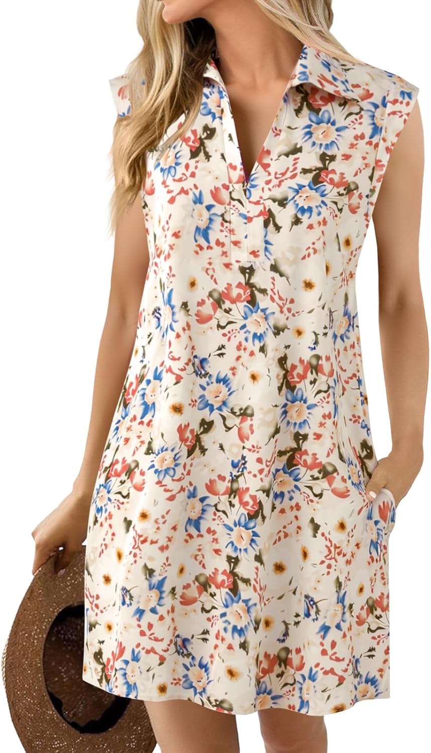 Wenrine Womens Summer Dresses Floral Casual Collared V Neck Cap Sleeve Loose Boho T Shirt Dresses with Pockets