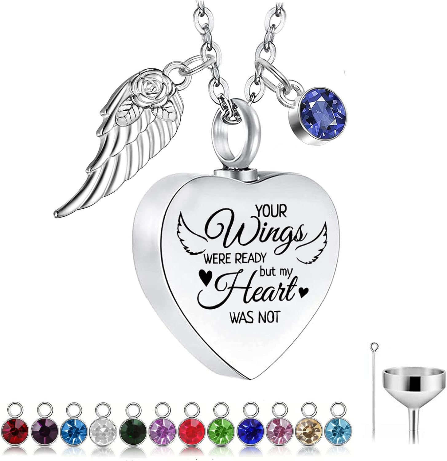 Cremation Heart Urn Necklace for Ashes for Women with 12 Birthstones, Cremation Ashes Jewelry Keepsake with Angel Wing - Your Wings were Ready, But My Heart was Not …