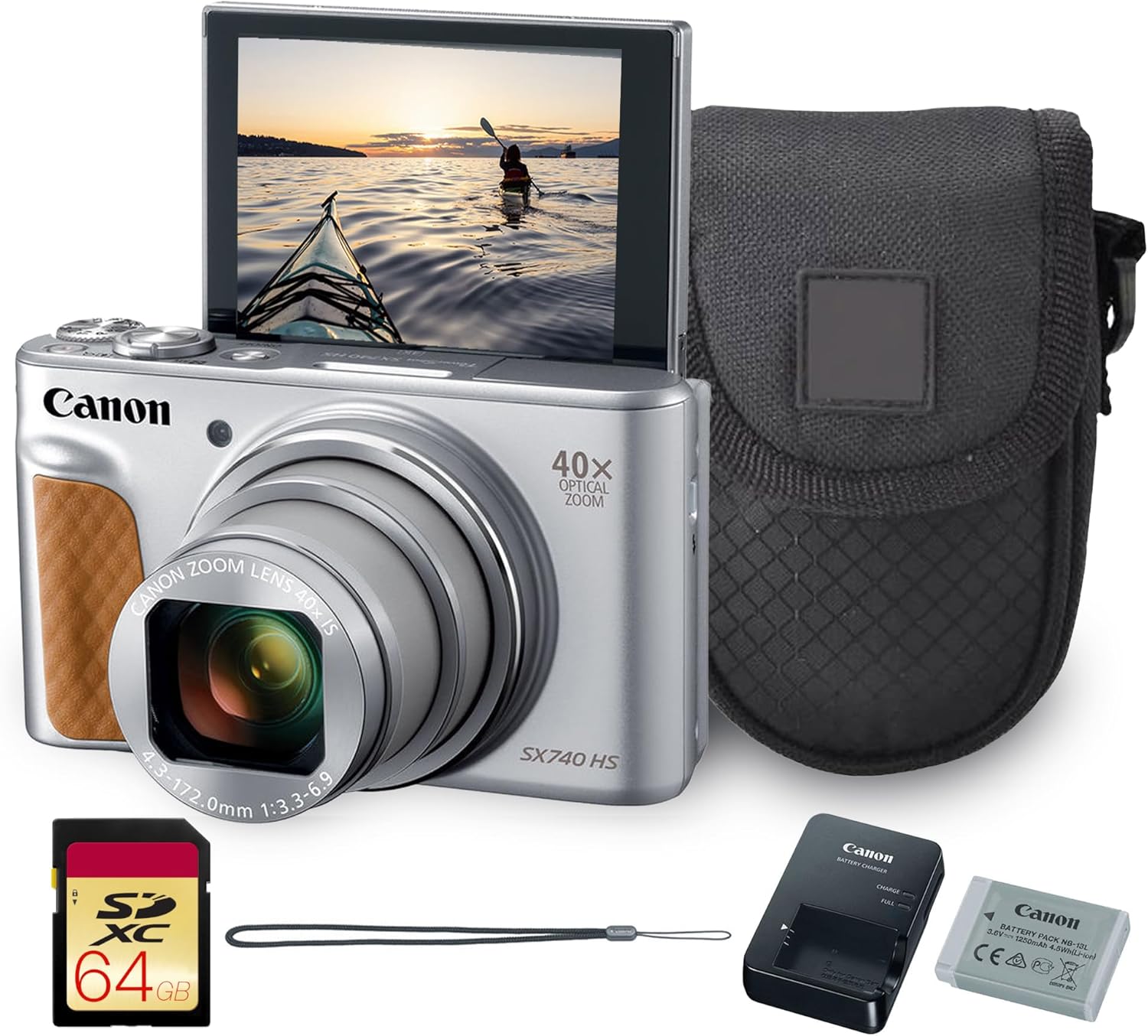 - Canon USA Authorized. Items Include: Canon PowerShot SX740 HS Digital Camera (Silver) – 20.3MP, 40x Optical Zoom, 4K UHD Video, Wi-Fi & Bluetooth, Compact Point & Shoot, Bag, 64GB UHS-I SDXC Memory Card