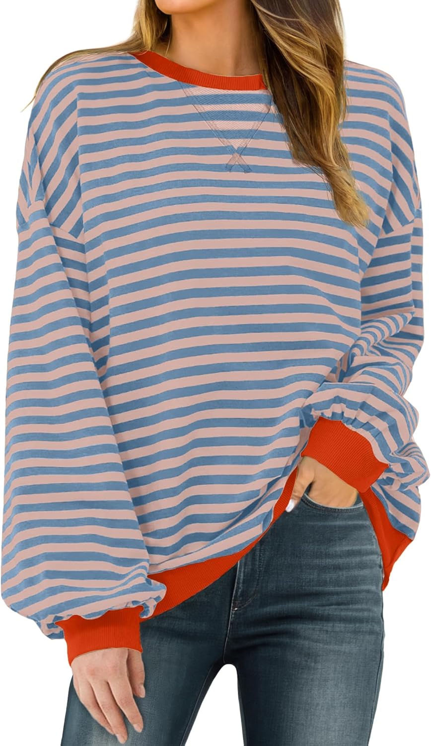 Women Sweatshirt Striped Crew Neck Oversized Long Sleeve Sweatshirt Color Block Loose Pullover