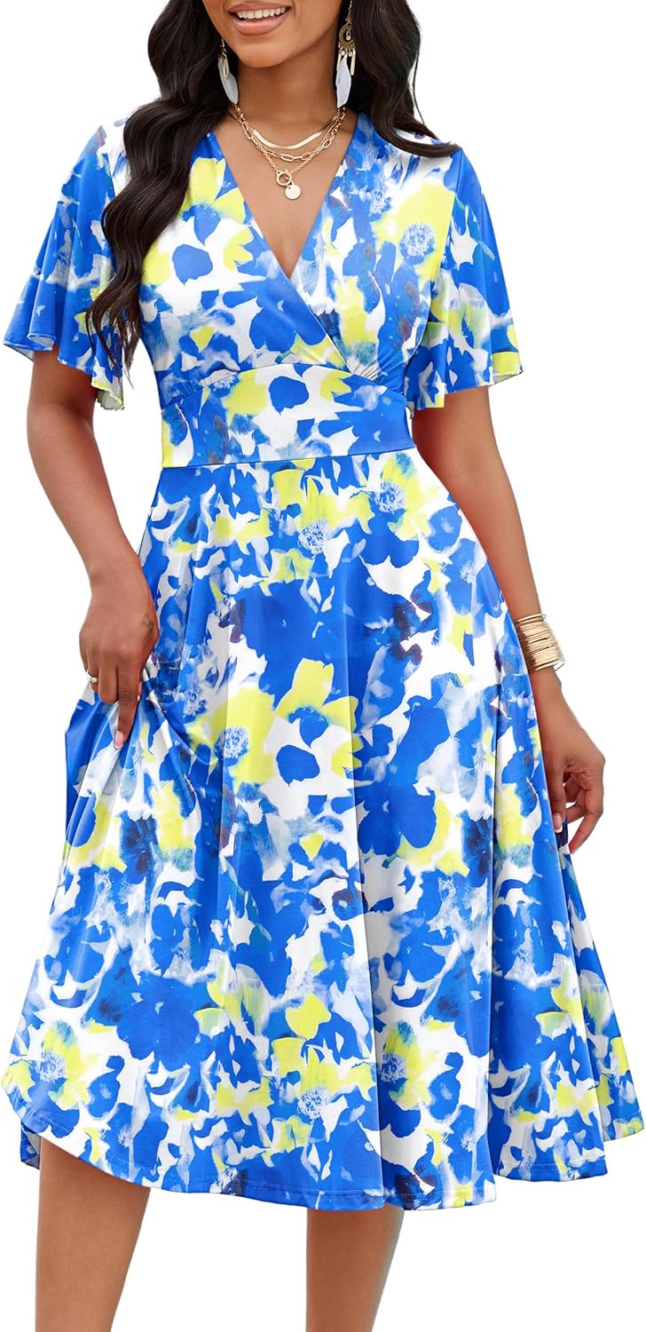 FANDEE Women's Casual Midi Dress Short Sleeve Ruffle V Neck Colorful Cocktail A-Line Flowy Loose Vacation Dresses