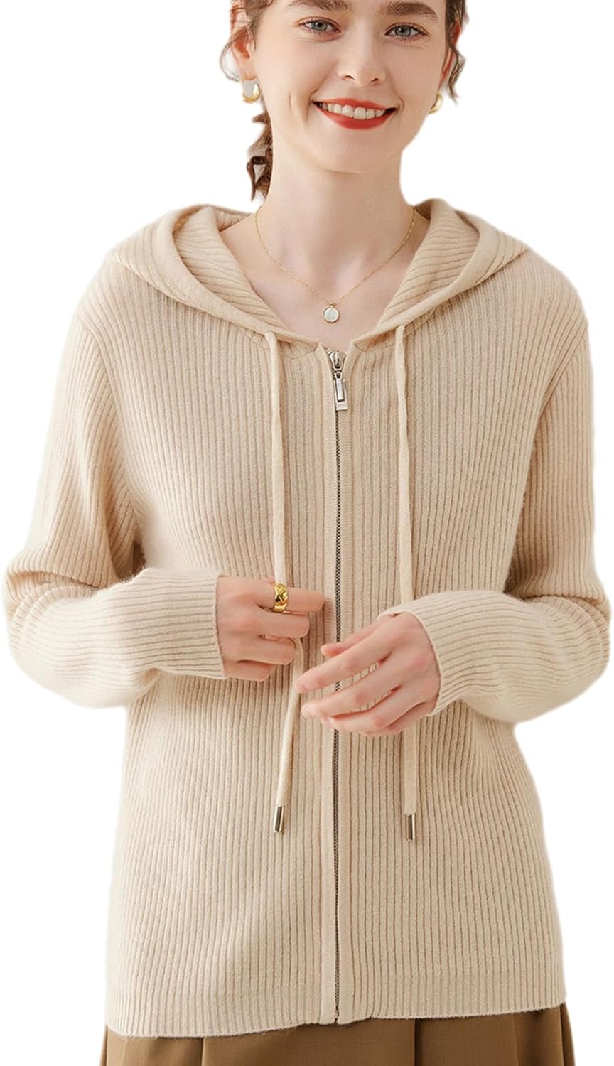 Women's Cashmere Blend Merino Wool Cardigan Full Zip Open Front Drawstring Hoodie Sweater Long Sleeve Lightweight