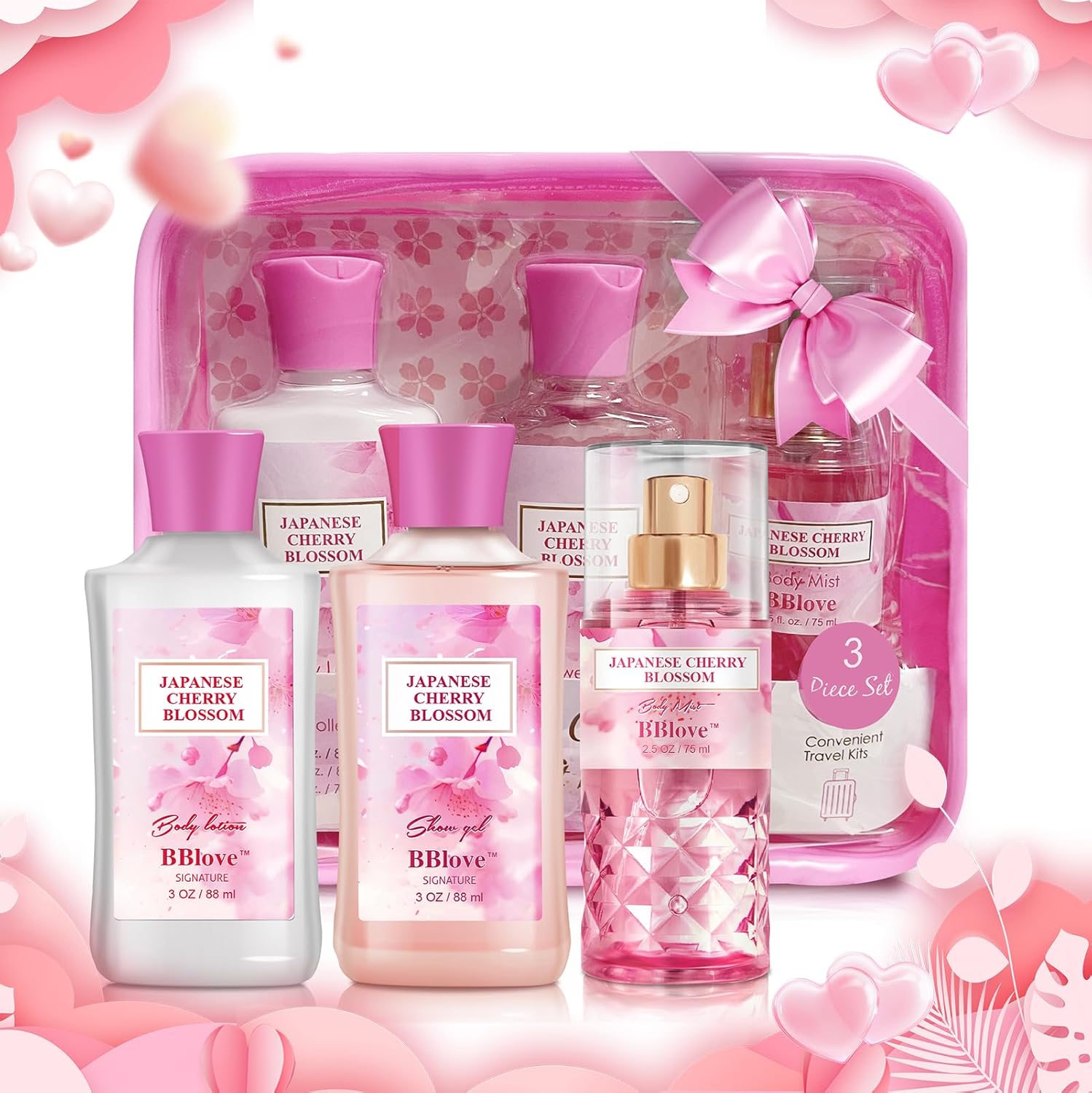 Bath and Body Gift Set for Women & Girls, Japanese Cherry Blossom, 3PCS Set for - Shower Gel, Body Lotion, Body Mist, Body Care Travel Set