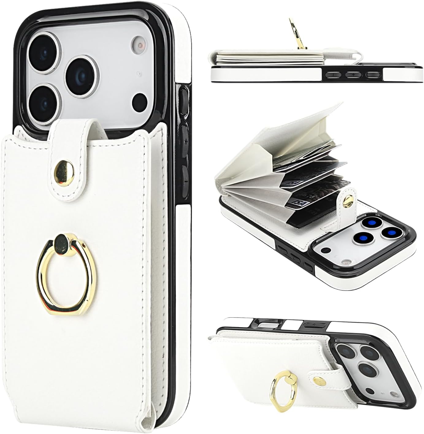 Folosu Compatible with iPhone 17 Pro Case Wallet with Card Holder, 360°Rotation Finger Ring Holder Kickstand, RFID Blocking Leather Protective Double Buttons Shockproof Cover 6.3 Inch White