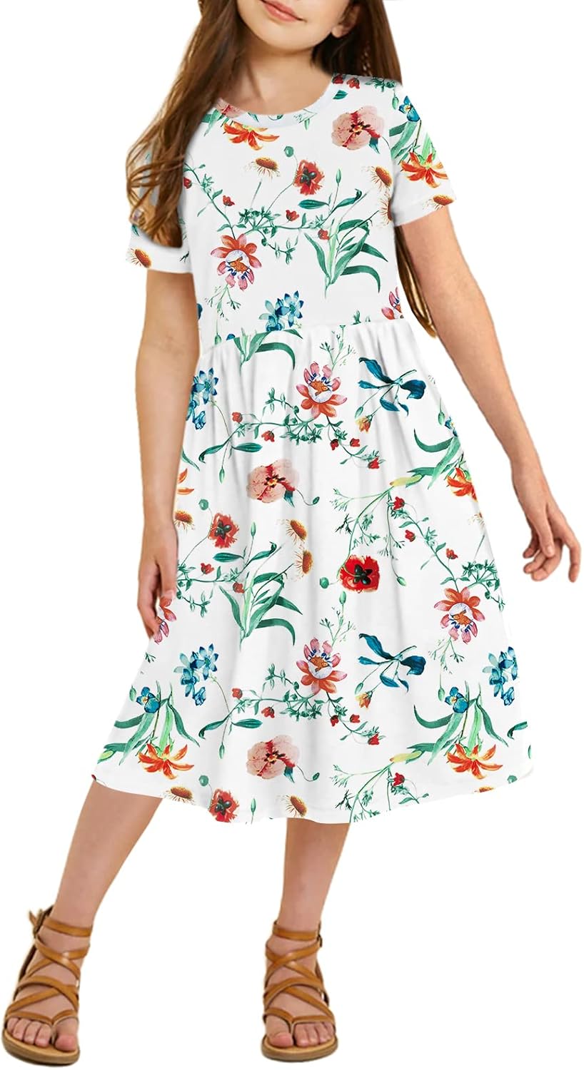 21KIDS Girl Maxi Dress Floral Short Sleeve Dresses with Pockets for Girls 6-14 Years