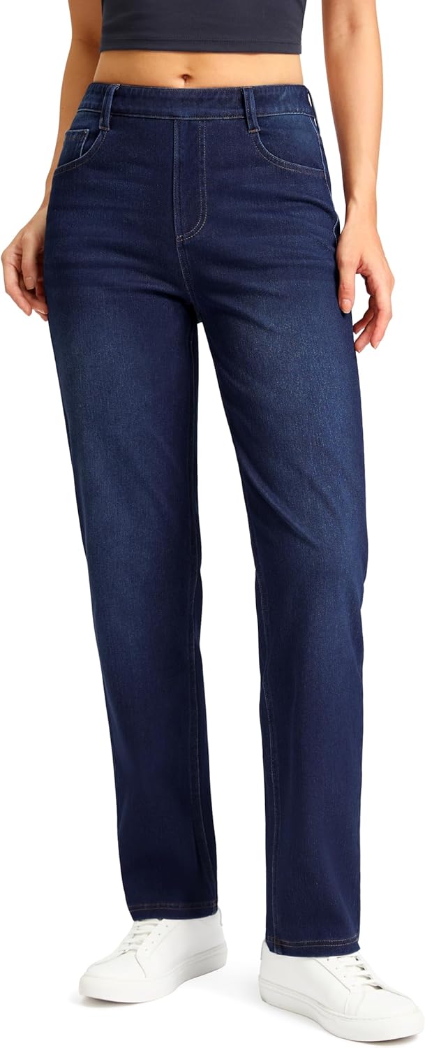 Rammus Straight Leg Jeans for Women Stretchy Pull on Sweatpant Jean Trendy Tummy Control High Waisted Denim Pants
