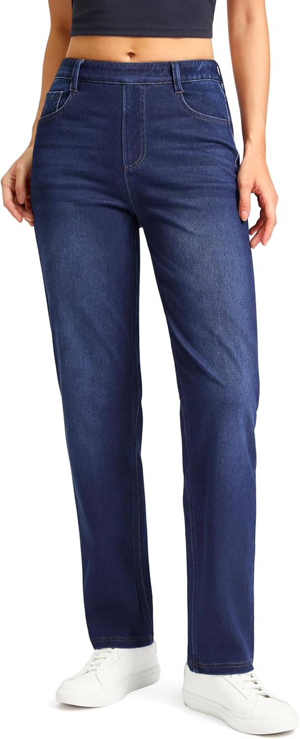 Rammus Straight Leg Jeans for Women Stretchy Pull on Sweatpant Jean Trendy Tummy Control High Waisted Denim Pants