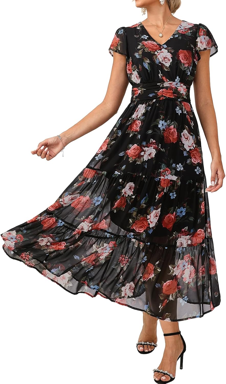 GRACE KARIN 2026 Women Summer Dress,Maxi Short Sleeve Floral Dresses,Semi Formal Flowy Wedding Guest Dress with Pocket