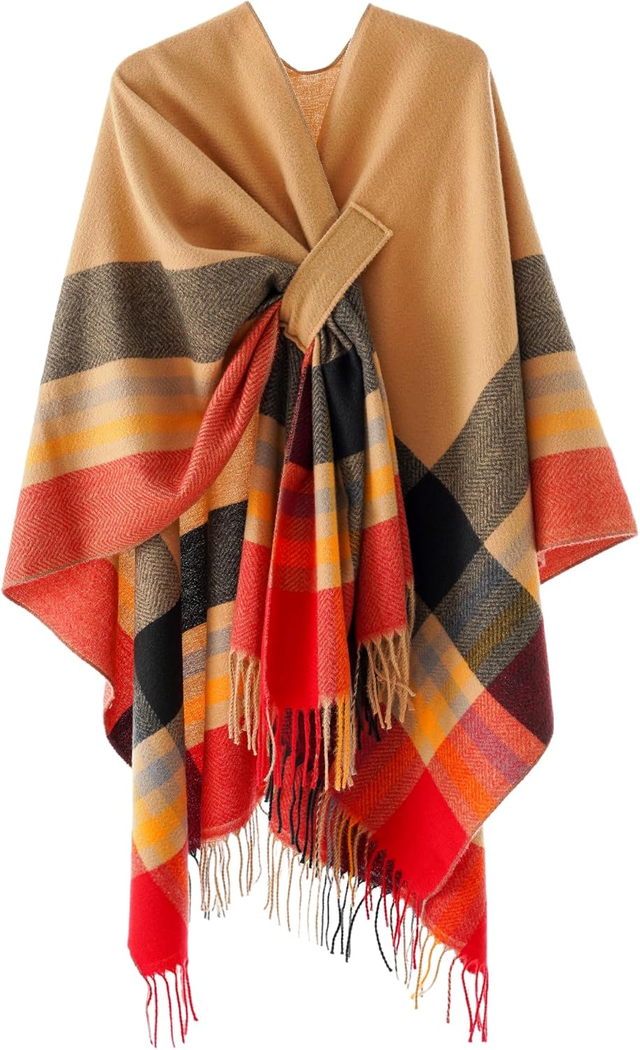 YnimioAOX Women's Poncho Shawl Wrap Soft Knit Cross Front Plaid Cape Cardigan with Tassels for Fall Winter