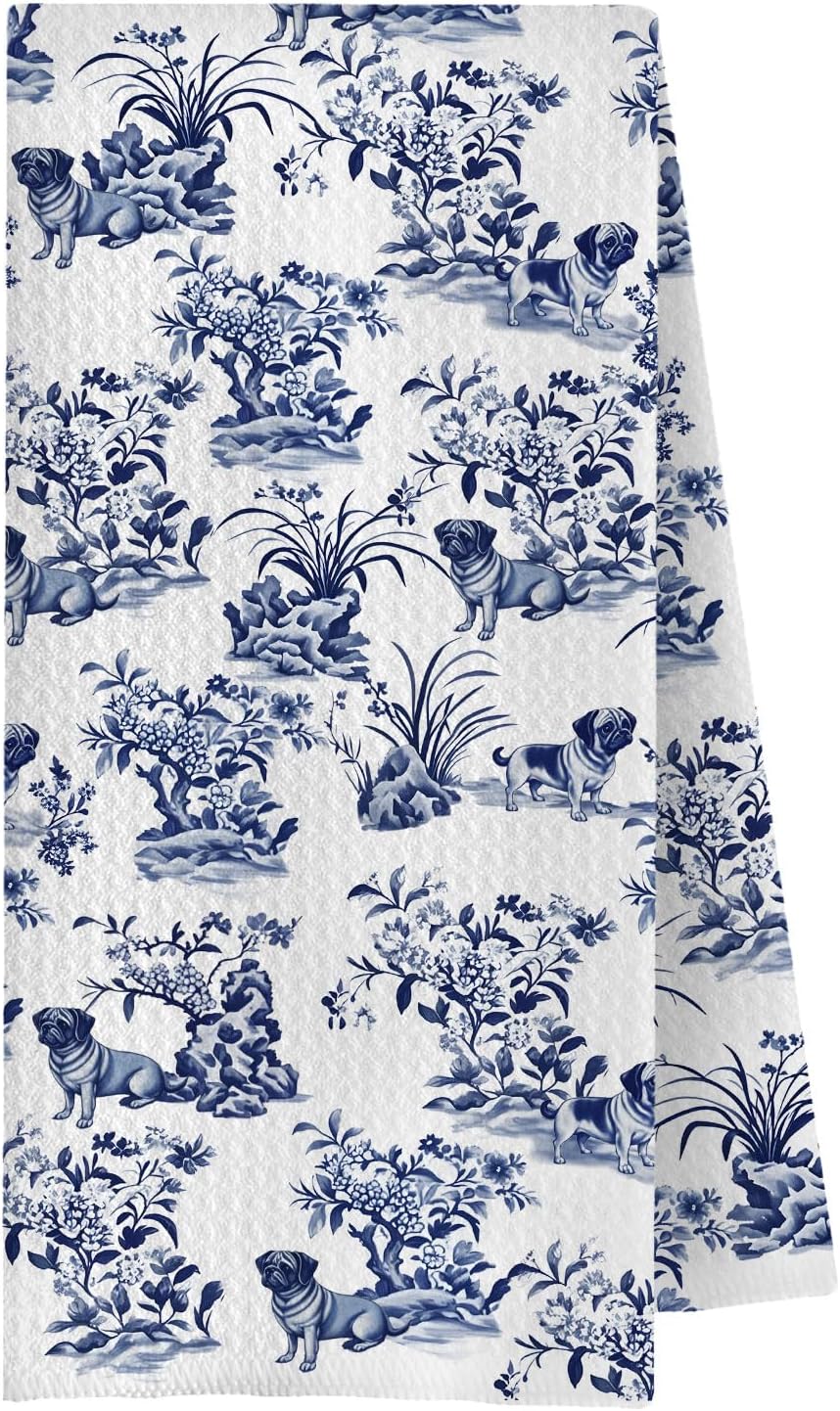 Blue Chinoiserie Pug Kitchen Towels, Gifts for Pug Lovers Women Dish Tea Towels for Kitchen Decor, Grand Millenial Floral Dog Decorative Hand Towels for Bathroom, 16x24 Inches