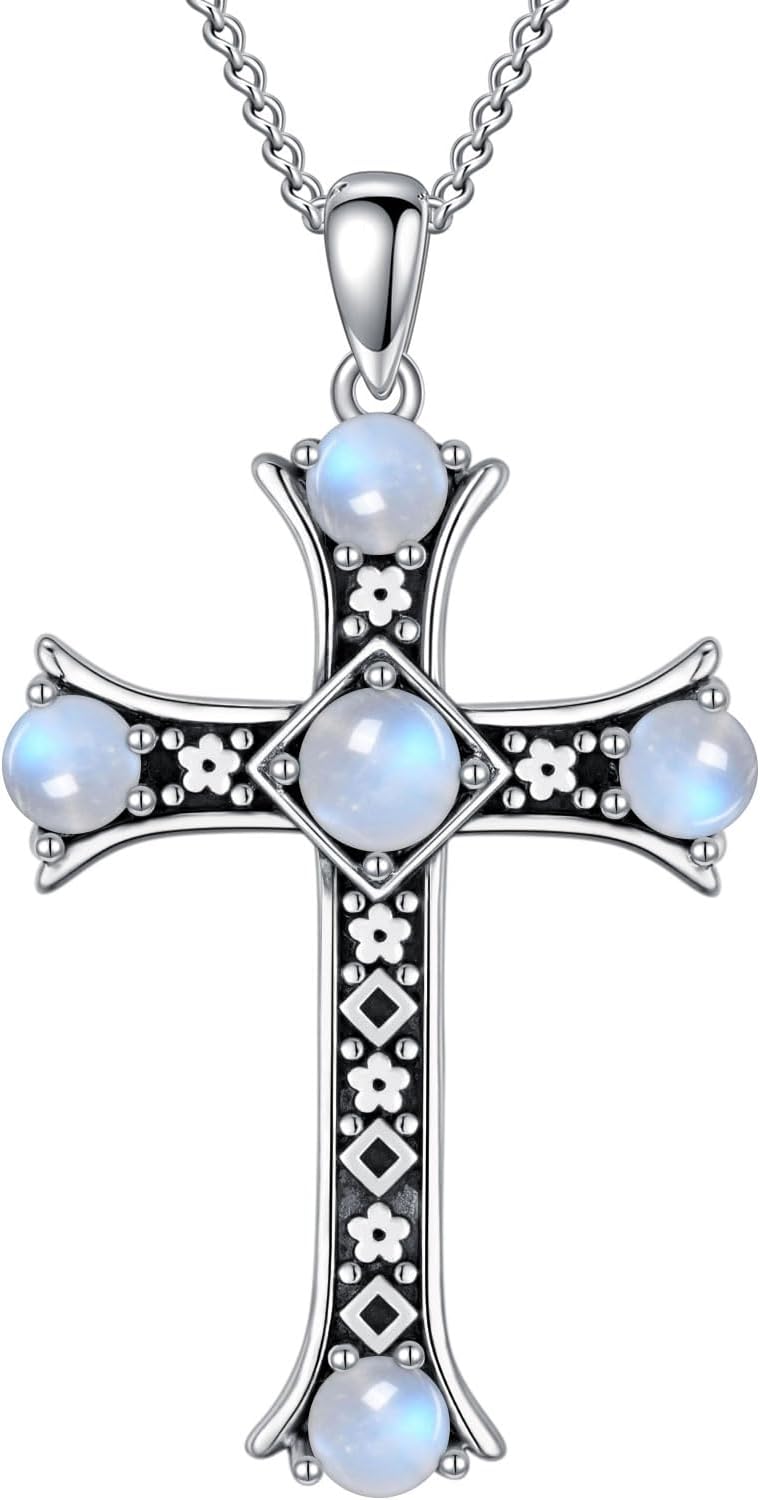 Natural Moonstone Cross Necklace for Women 925 Sterling Silver Blue Moonstone Cross Pendant June Birthstone Boho Jewelry Gift for Wife Mom