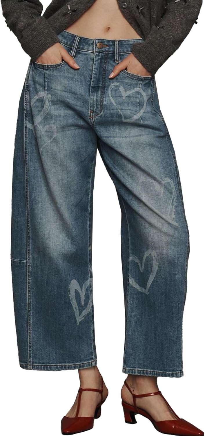 Women's Heart Barrel Jeans Wide Leg Tapered Jeans Baggy Valentine's Day Demin Pants with Pockets