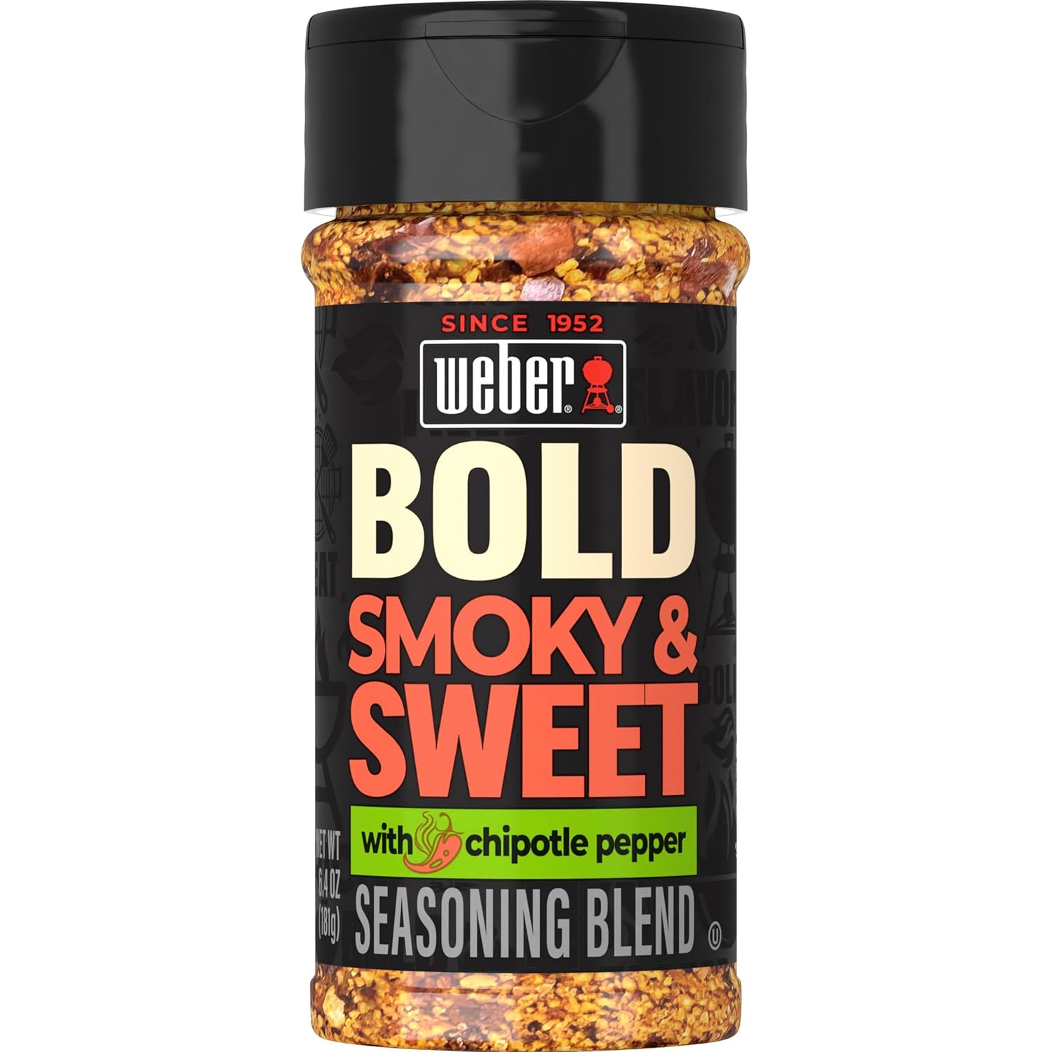 - One 6.4 oz shaker bottle of Weber BOLD Smoky & Sweet Seasoning Blend with chipotle pepper — experience flavors that go big with this sweet and smoky seasoning