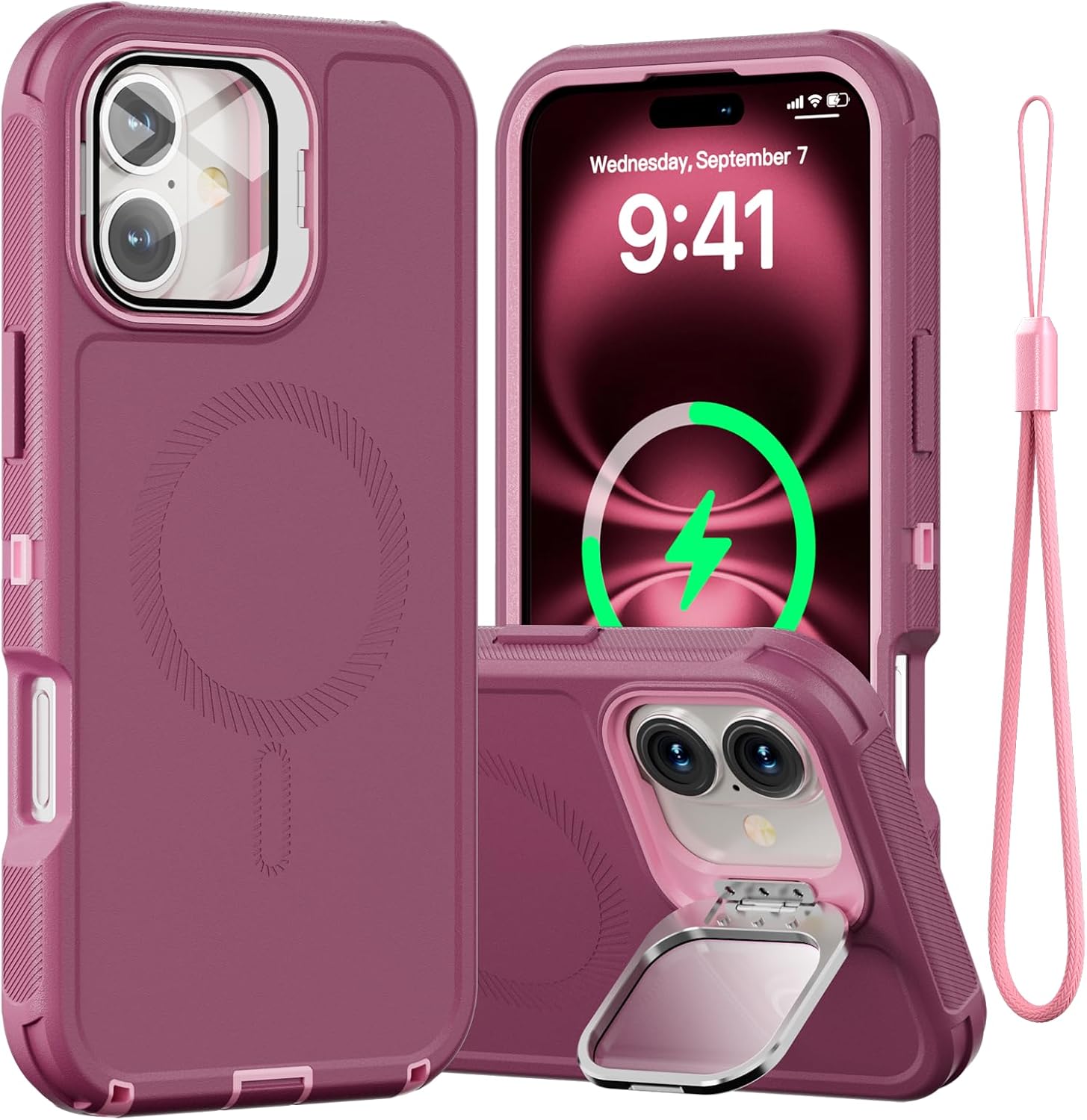 for iPhone 16 Plus Case with Stand & Built-in Camera Cover, MagSafe Compatible, Heavy-Duty Shockproof Protection, Magnetic & Rugged Phone Cover for iPhone 16 Plus 6.7'', Purple-Pink