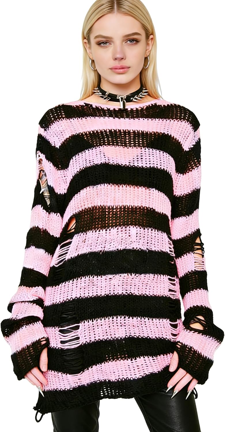Goth Y2K Striped Sweater Grunge Ripped Punk Gothic Sweaters for Women Harajuku Aesthetic Halloween Pullover Tops