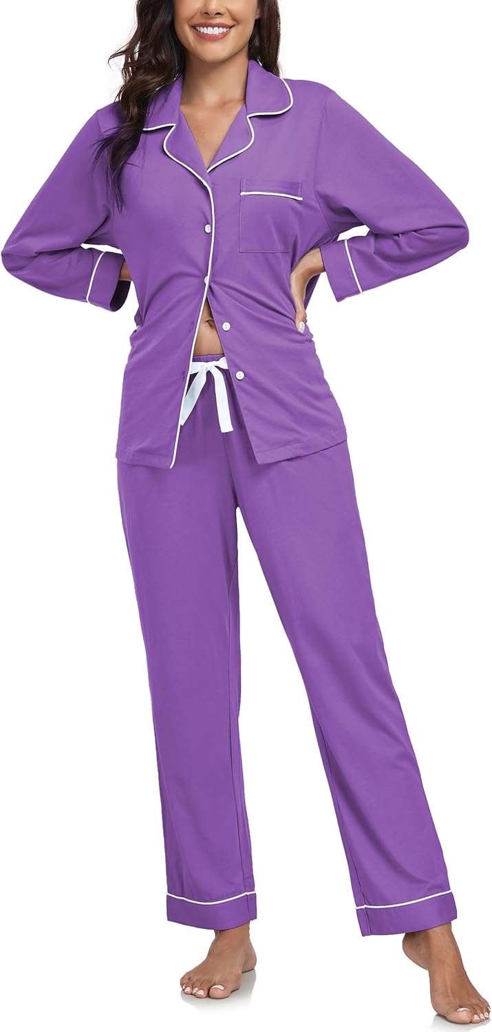 CF Womens 100% Cotton Pajama Sets Long Sleeve Fall Pajamas Soft Button Down 2 Piece Lounge Sets Sleepwear with Pockets S-XXL