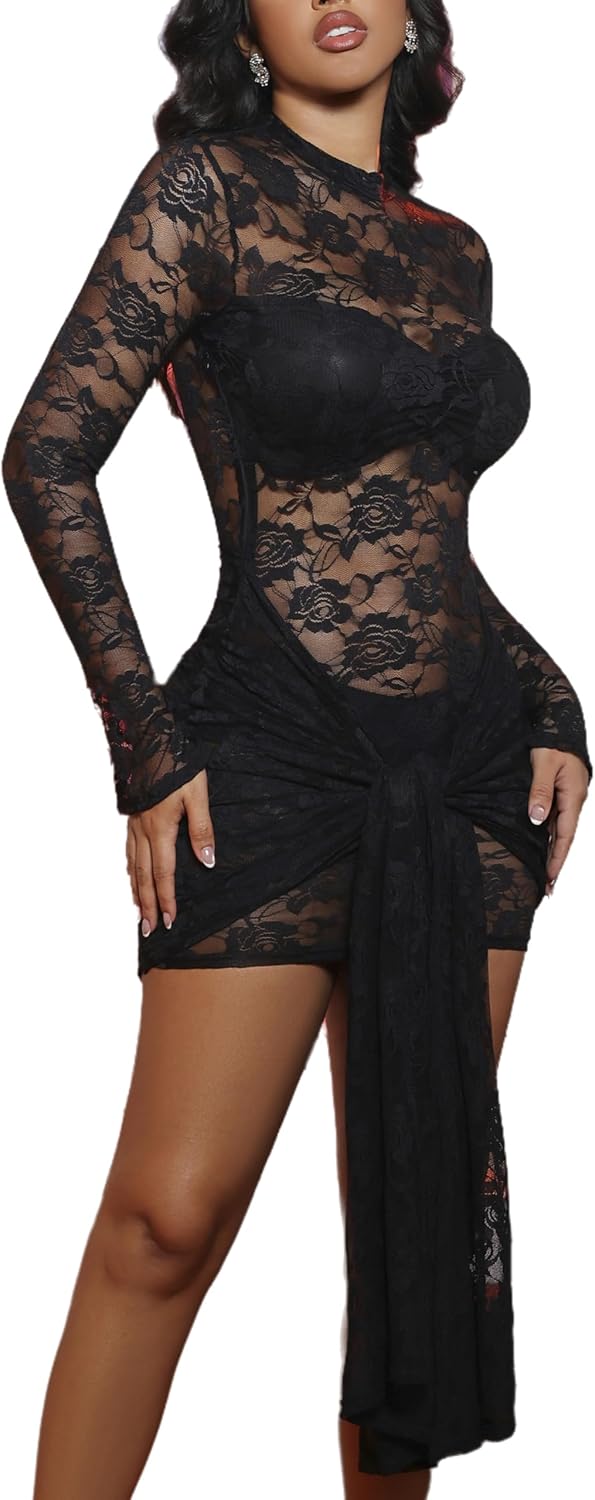 acelyn Women’s Sexy Floral Lace Bodycon Mini Dress Long Sleeve Mock Neck Cocktail Party Birthday Club Dress