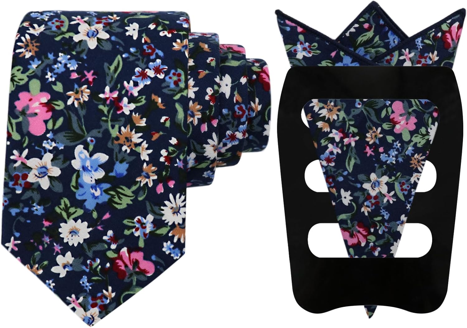 Mantieqingway Floral Tie Sets for Men Skinny Cotton Flower Neckties with Handkerchief and Pocket Square Holder for Wedding