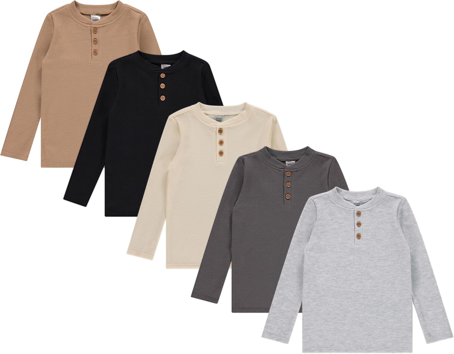 Cudlie 5-Pack Boys' Henley Long Sleeve Shirts – Soft Cotton Blend Toddler Tops, Everyday Basics, Size 12M - 4T