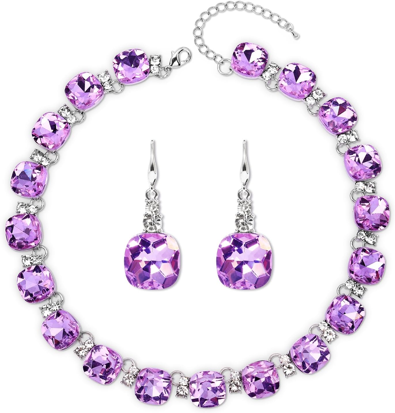 Clear Purple Austrian Crystal Wedding Bridal Jewelry Set for Brides Bridesmaid, Gemstone Statement Necklace and Earring Set Formal Prom Jewelry Set for Silver-Tone Fit With Wedding Evening Dress