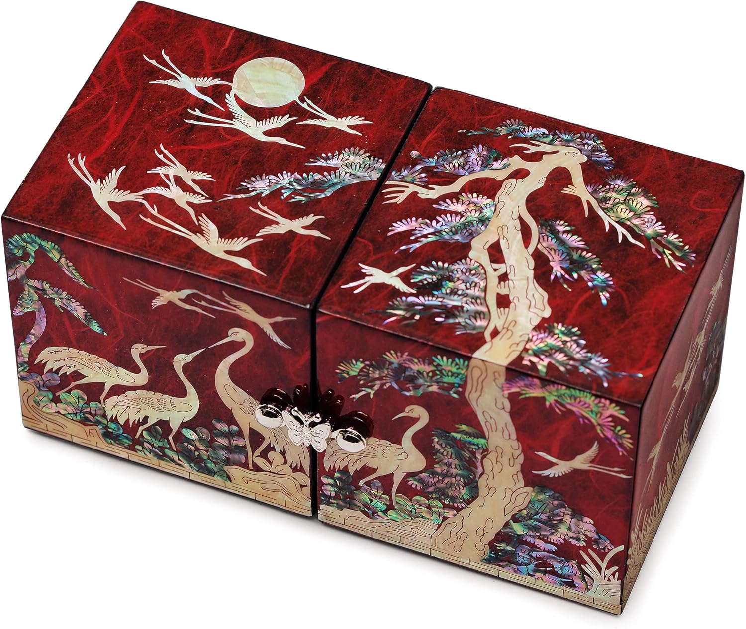 MADDesign Mother of Pearl Twin Cubes Lacquered Jewelry Box Crane Pine Tree Red