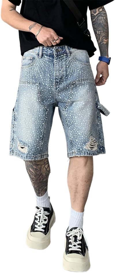Men's Loose Fit Jean Shorts Straight Leg Casual Rhinestones Denim Shorts