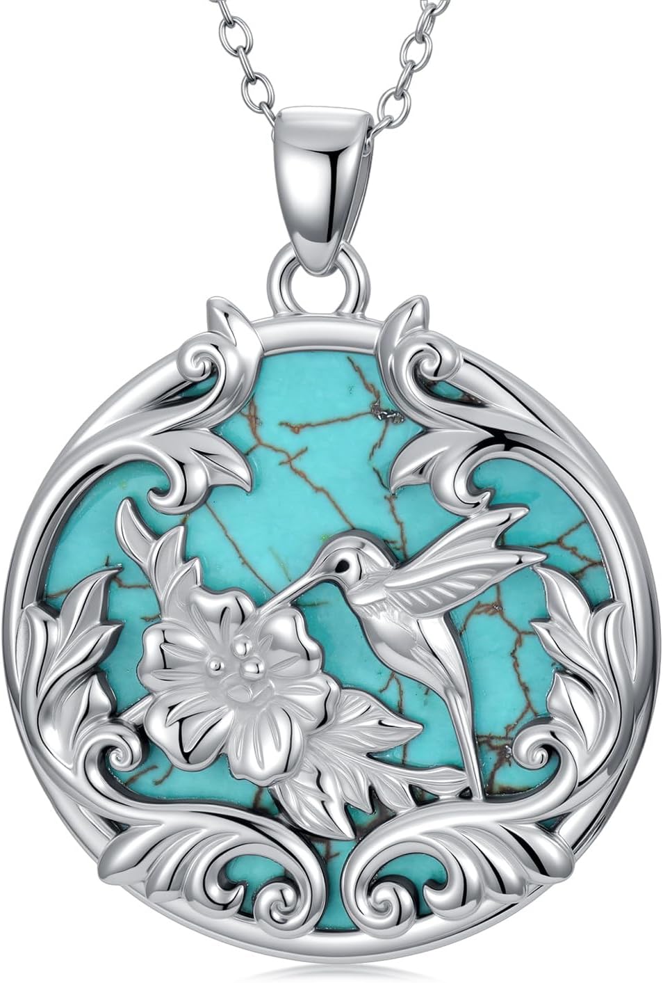 Natural Turquoise Hummingbird Necklace S925 Sterling Silver Hummingbird Pendant Necklace Genuine Gemstones Hummingbirds Jewelry Gifts for Women