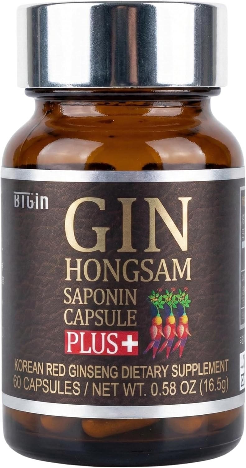 Gin Hongsam Saponin Capsule Plus Korean Red Panax Ginseng Extract - Rg3 & Compound K Enriched Supplement - Caffeine Free Extra Strength Energy, Focus & Immune Support - 60 Capsules