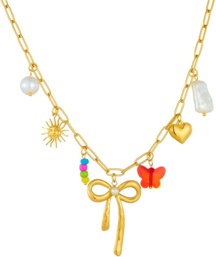 Kokoma Hollow Bow Knot Pendant Necklace for Women Simulated Pearl Sun Butterfly Charms Link Chain Adjustable Stainless Steel Choker Fashion Jewelry